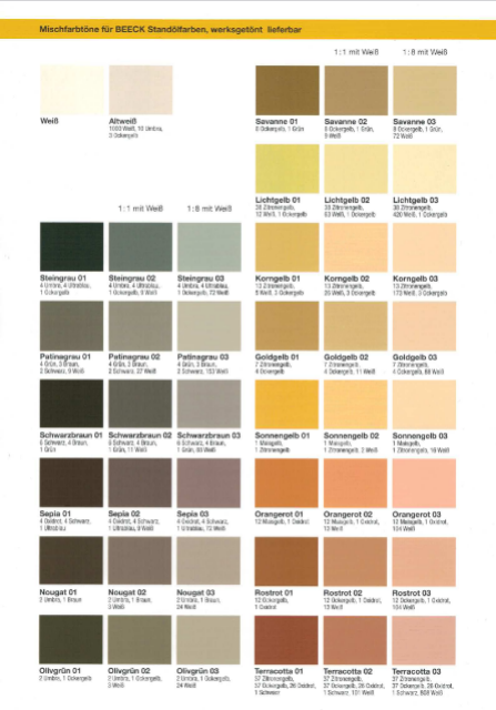 Die Standölfarben von Beeck sind mit feinen Mineralpigmenten verbundene Leinöl-Standöl-Verkochung. Sie sind von exzellenter Dauerhaftigkeit und Wartungsfreundlichkeit.
