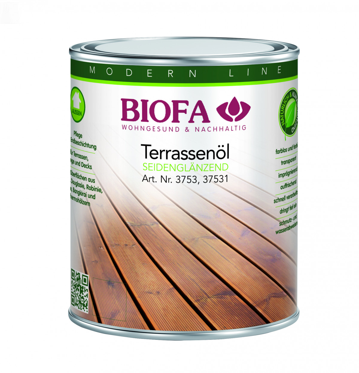 Die natürlichen Öle dringen tief in das Holz ein und schützen es vor Feuchtigkeit. BIOFA Terrassenöl nur für den Außenbereich verwenden.